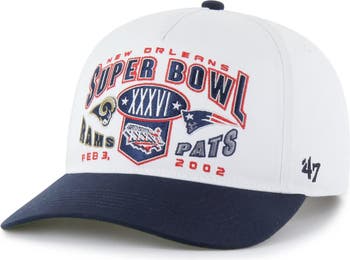 Celebrate the legacy of the NFL's grand finale by rocking this Super Bowl XXXVI Throwback Dueling Logos Adjustable Hitch Hat from '47. Constructed from garment-washed cotton, this hat offers a comfortable, worn-in feel that's perfect for everyday wear. The embroidered graphics pay tribute to the 2002 Super Bowl. Plus, the unstructured, relaxed fit and slightly curved bill give it a classic, laid-back vibe, making it an essential addition to any NFL fan's collection.