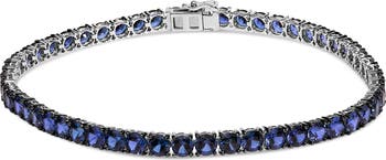 Immerse yourself in the exquisite elegance of this .925 sterling silver bracelet, an epitome of sophisticated craftsmanship designed for the modern man. Rhodium-plated to enhance durability and prevent tarnish, this piece promises an enduring brilliance. Flaunting a classic tennis bracelet silhouette, it is meticulously adorned with lab-created, color-treated blue sapphires that captivate with their vibrant hue. Each 4x4 mm gemstone is precisely nestled in a 4-prong setting with distinctive black rhodium accents, creating a striking visual contrast that dances with light. Measuring 8.5 inches, it drapes gracefully around the wrist, offering a comfortable fit and an unmistakable statement of style. This masterpiece not only embodies luxury but also celebrates a refined aesthetic with its bold gemstone presence and meticulous attention to detail.