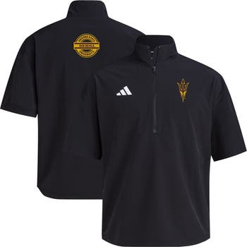Prepare for rainy days with this Arizona State Sun Devils 2024 Half-Zip Short Sleeve Training Jacket from adidas. The lightweight design is made with water-resistant ripstop fabric and a loose fit to keep you dry and comfortable. With metallic details, this Arizona State Sun Devils jacket lets you represent your favorite team in functional style.