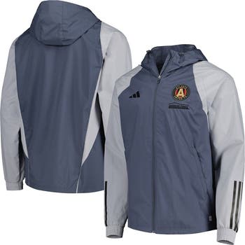 Defend against inclement conditions when you put on this All-Weather jacket from adidas. Featuring the Atlanta United FC crest, its elastic cuffs help block out the elements, while mesh lining provides a breathable feel. Raglan sleeves also create some extra arm room for more flexible movement in this Atlanta United FC full-zip hoodie.