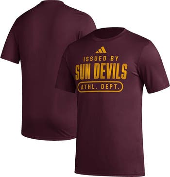 The adidas Maroon Arizona State Sun Devils AEROREADY Pregame T-Shirt is the perfect way to show your support for the Sun Devils. Made from recycled polyester, this comfortable and sustainable t-shirt features a crew neck, screen-printed graphics, and a rounded droptail hem for a stylish look. Whether you're cheering on the Sun Devils at the game or showing your support around town, this t-shirt is a must-have for any fan.