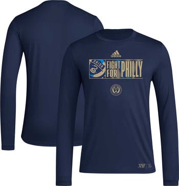Celebrate your unwavering support for the Philadelphia Union with the Men's adidas Navy Philadelphia Union 2024 Jersey Hook AEROREADY Long Sleeve T-Shirt. Crafted from recycled polyester, this long-sleeve tee features AEROREADY technology to keep you dry and comfortable during the most intense matches. The rounded droptail hem adds a touch of style, while the Philadelphia Union crest and MLS logo proudly display your allegiance. Whether you're cheering from the stands or representing your team off the field, this jersey is the perfect way to show your Philadelphia Union pride.
