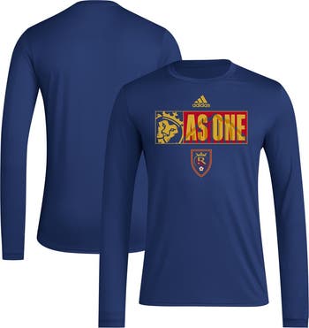 Celebrate your unwavering support for Real Salt Lake with the men's adidas navy Real Salt Lake 2024 jersey Hook AEROREADY long sleeve T-shirt. Crafted from recycled polyester, this moisture-wicking tee features a droptail hem for enhanced coverage. Show your allegiance to Real Salt Lake and the MLS with pride, as the team's official logos adorn the chest and sleeve.