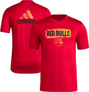 Celebrate your unwavering support for the New York Red Bulls with the adidas Red New York Red Bulls Local Pop AEROREADY T-shirt. Crafted from recycled polyester, this breathable tee features AEROREADY technology to keep you cool and comfortable during intense matches. Its crew neck and droptail hem provide a classic fit, while the bold New York Red Bulls logo proudly displays your allegiance to the MLS powerhouse. Whether you're cheering from the stands or representing your team off the field, this t-shirt is the perfect way to show your Red Bulls pride.