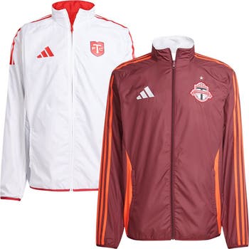 Embrace your Toronto FC pride with this 2025 Anthem Reversible Full-Zip Jacket from adidas. This reversible jacket offers two distinct looks in one, featuring screen print graphics on one side and a sublimated design on the other. Made from recyclable materials, it boasts a comfortable midweight construction ideal for moderate temperatures, while elastic cuffs and a bottom hem offer a secure and personalized fit.
