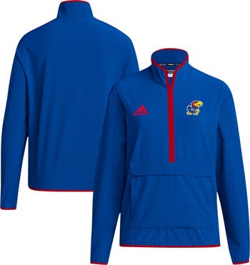 Gear up in Kansas Jayhawks style with this adidas Coaches Sideline Half-Zip Jacket. This official sideline jacket is made with sustainable recycled polyester and features a mock neck for extra coverage. The heat-sealed team logo on the left chest adds a touch of authenticity, while the lightweight design ensures comfort during mild temperatures. The front pouch pocket with flap closure and zippered pocket provide convenient storage for your essentials, making this Kansas Jayhawks jacket perfect for game day or a casual outing.