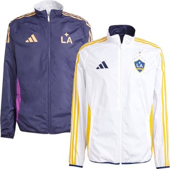 Embrace your LA Galaxy pride with this 2025 Anthem Reversible Full-Zip Jacket from adidas. This reversible jacket offers two distinct looks in one, featuring screen print graphics on one side and a sublimated design on the other. Made from recyclable materials, it boasts a comfortable midweight construction ideal for moderate temperatures, while elastic cuffs and a bottom hem offer a secure and personalized fit.