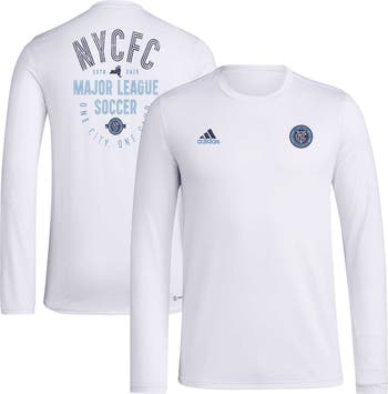 The adidas Men's White New York City FC Local Stoic Long Sleeve T-shirt is the perfect way to show your support for the New York City FC. Made from recycled polyester, this comfortable and stylish shirt features a crew neck and the official New York City FC logo. Whether you're cheering on the team at the stadium or just showing your support around town, this shirt is sure to turn heads.