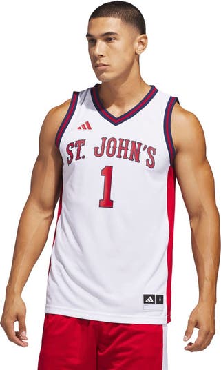 Are you ready to rep your favorite college basketball team? This adidas St. John's Red Storm Home Replica Basketball Jersey is the perfect addition to any Red Storm fan's wardrobe. Made from 100% recycled polyester, this slim-fit jersey features lightweight mesh fabric designed for performance, ensuring both comfort and style. The ribbed V-neck, sleeve cuffs with striped details, and heat-transfer branding, along with the screen-printed school wordmark and numbers, make this jersey a must-have for showing your Red Storm pride.