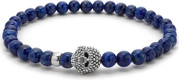 A Caviar-beaded skull charm made from polished sterling silver shines at the center of this stretch bracelet adorned with smooth lapis lazuli beads.