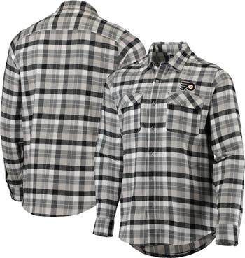 The Men's Antigua Black/Gray Philadelphia Flyers Ease Plaid Button-Up Long Sleeve Shirt is the perfect way to show your support for the Philadelphia Flyers. With its embroidered graphics and full-button front, this shirt is both stylish and comfortable. The one-button cuff and rounded hem add a touch of sophistication, while the two chest pockets with button provide ample storage space. Made from 100% cotton, this shirt is breathable and easy to care for. Whether you're cheering on the Flyers at the game or just relaxing at home, this shirt is sure to become a favorite.