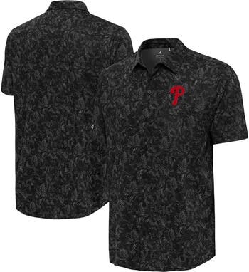 Get in vacation mode while sporting your Philadelphia Phillies in style with this Button-Up Shirt from Antigua. The relaxed fit and self-collar with top sleeve stitching make it a comfortable and stylish option for any casual occasion. The embroidered team patch heat-sealed to the left chest adds a touch of team spirit, while the palm tree print throughout provides a laid-back, island-ready look.