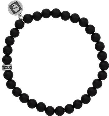 A signature sterling silver skull charm dangles from a stretch bracelet lined in rich onyx beads.