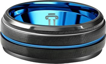 This unique mens ring is made of solid tungsten and features a blue accent. The edge is polished with a beveled edge.