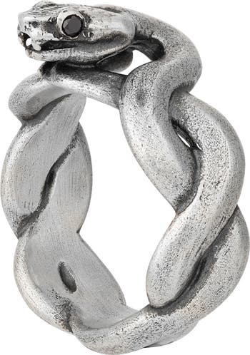 A striking snake with black diamond eyes symbolizes strength and protection on this sterling silver ring boasting a weathered finish.