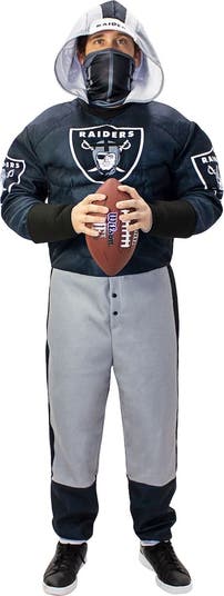 Transform into a Las Vegas Raiders player with this Game Day costume in team colors. The bodysuit features padded faux muscles, official Las Vegas Raiders graphics and a zipper closure for easy dressing. Plus, polyester material creates a soft feel for hours of comfortable wearing.