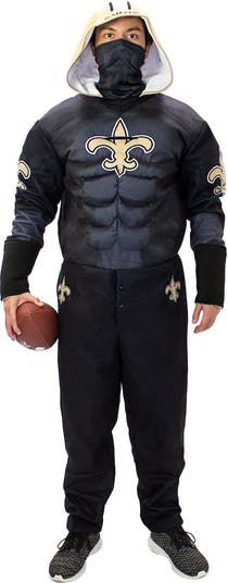Transform into a New Orleans Saints player with this Game Day costume in team colors. The bodysuit features padded faux muscles, official New Orleans Saints graphics and a zipper closure for easy dressing. Plus, polyester material creates a soft feel for hours of comfortable wearing.