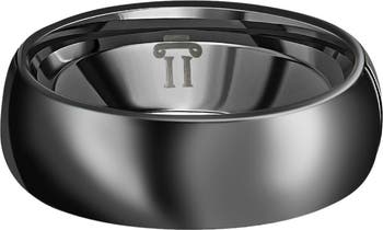 This classic men's wedding band is made of solid black tungsten. It measures 7mm wide and has a comfort fit inside the edge. The finish is polished so it has a shiny look to it.