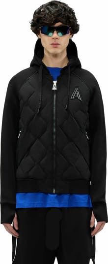 Transition effortlessly through seasons with our versatile hybrid bomber. Featuring a removable hood, sporty raglan cut, intricate wave stitching pattern, and soft scuba combo material for comfort and style in any setting.