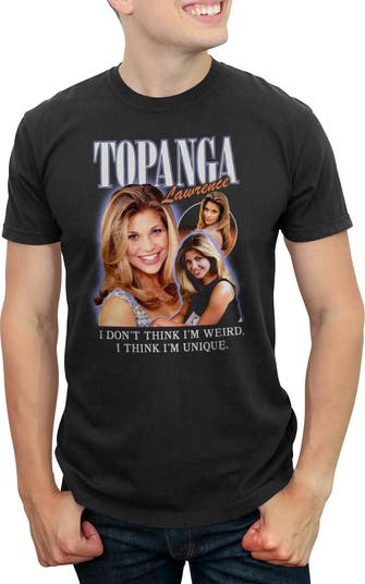 - Get your dose of '90s wisdom with this stylish new men's t-shirt that is perfect for every occasion! Featuring a collage of Topanga Lawrence's radiant smiles, her name, and the memorable quote: "I Don’t Think I'm Weird. I Think I'm Unique." printed across the front.