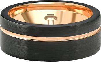 This unique men's ring is made of solid brushed black tungsten and features a two-tone rose gold plated inside and inlay groove. The center is brushed.