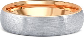 This unique men's ring is made of solid tungsten and features a two tone rose gold plated inside. The inside edge is polished with a brushed outside edge.