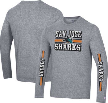 The Men's Champion Heather Gray San Jose Sharks Tri-Blend Dual-Stripe Long Sleeve T-Shirt is the perfect way to show your unwavering support for the San Jose Sharks. Made from a comfortable tri-blend of polyester, cotton, and rayon, this long sleeve tee features distressed screen print graphics that proudly display the Sharks logo. The crew neck and slight droptail provide a classic fit, while the tri-blend fabric ensures breathability and durability. Whether you're cheering from the stands or simply showing your Sharks pride, this t-shirt is a must-have for any San Jose Sharks fan.