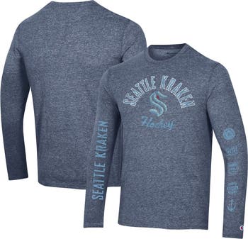 The Men's Champion Heather Navy Seattle Kraken Multi-Logo Tri-Blend Long Sleeve T-Shirt is a must-have for any true Seattle Kraken fan. With its distressed screen print graphics and comfortable crew neck, this shirt is perfect for showing your support for the team both on and off the ice. Made from a soft and durable polyester, cotton, and rayon blend, this shirt is sure to keep you comfortable all day long. Whether you're cheering on the Kraken at Climate Pledge Arena or just relaxing at home, this shirt is the perfect way to show your team spirit.