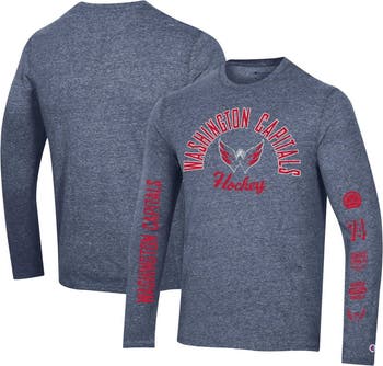 Celebrate your unwavering Washington Capitals fandom with the Champion Heather Navy Washington Capitals Multi-Logo Tri-Blend Long Sleeve T-Shirt. This stylish tee features distressed screen print graphics that proudly display the Washington Capitals logos, making it a must-have for any true fan. The comfortable crew neck and soft polyester, cotton, and rayon blend ensure all-day comfort, whether you're cheering from the stands or representing your team off the field.