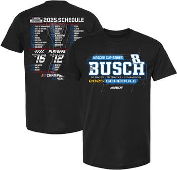 Commemorate the 2025 NASCAR Cup Series with this Kyle Busch T-shirt. This Checkered Flag Sports Schedule T-Shirt features bold Kyle Busch graphics on the front and the series schedule on the back, putting your die-hard NASCAR fandom on full display. Get pumped up and ready to cheer for Kyle Busch by adding this comfy cotton tee to your racing collection.