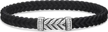 Channel-set diamonds border a sterling silver station at the center of this rubber chevron bracelet.