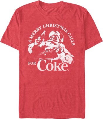 Get yourself on Santa's "Nice" list and enjoy the Coca-Cola Merry Christmas Men's T-Shirt! A jolly Santa Claus is portrayed relaxing with a bottle of coke and "A Merry Christmas Calls for Coke" encircling him in white print on this cool Coke shirt.