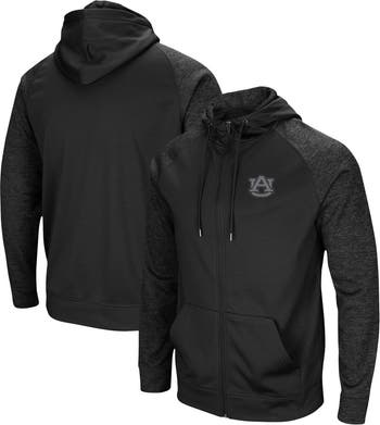 The Men's Colosseum Black Auburn Tigers Blackout 3.0 Tonal Raglan Full-Zip Hoodie is the perfect way to show your unwavering support for the Auburn Tigers. Made of soft polyester, this lightweight hoodie features a full-zip closure, drawstring hood, and raglan sleeves for a comfortable fit. The screen-printed Auburn Tigers logo proudly displays your team spirit, making it a must-have for any fan. Whether you're cheering on the Tigers at the stadium or relaxing at home, this hoodie will keep you warm and stylish.