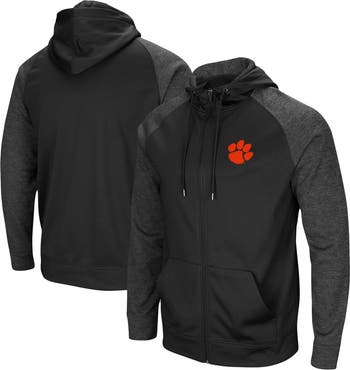 Sport sleek Clemson Tigers outerwear in this Blackout full-zip hoodie from Colosseum. It features athletic-style raglan sleeves and subtle Clemson Tigers graphics. You'll take your casual look up a notch with this hoodie.