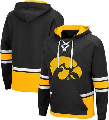 The Men's Colosseum Black Iowa Hawkeyes Lace Up 3.0 Pullover Hoodie is the perfect way to show your unwavering support for the Iowa Hawkeyes. Crafted from a soft cotton and polyester blend, this midweight hoodie ensures comfort and warmth during chilly game days. The embroidered fabric applique and sewn-on stripes proudly display your Iowa Hawkeyes pride, while the lace-up neck and front pouch pocket add a touch of style and functionality. Whether you're cheering from the stands or simply showing your support, this hoodie is the perfect way to represent the Iowa Hawkeyes in style.