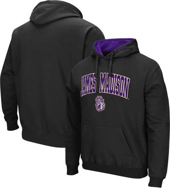 The Men's Colosseum Black James Madison Dukes Arch and Logo Pullover Hoodie is the perfect way to show your support for the James Madison Dukes. Made from a midweight fabric, this hoodie is ideal for moderate temperatures. The front pouch pocket is perfect for storing your essentials, and the drawstring hood provides warmth and comfort. The James Madison Dukes Arch and Logo are proudly displayed on the front, allowing you to showcase your team spirit wherever you go.