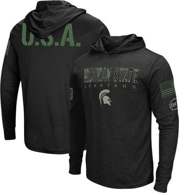 Represent more than just the Michigan State Spartans with this Tango hoodie T-shirt from Colosseum. Featuring a sublimated camo pattern, this top has sleek OHT Military Appreciation graphics on the chest and back, along with patches on the sleeves for extra flair. The bold Michigan State Spartans details show their allegiance for their team and patriotic spirit simultaneously.