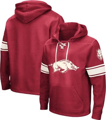 When the temperature drops, get ready for game day by layering up in this Arkansas Razorbacks Hockey hoodie from Colosseum. It features signature Arkansas Razorbacks graphics printed on the chest and contrasting sleeve stripes that draw eyes to your unshakable team pride. The lace-up neck detail makes this cozy pullover resemble a hockey jersey, while the front pouch pocket gives it a classic look and convenient, small-item storage.