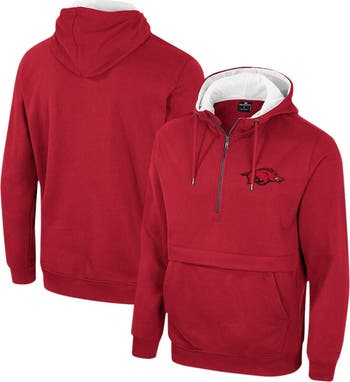 The Men's Colosseum Cardinal Arkansas Razorbacks Half-Zip Hoodie is the perfect way to show unwavering support for the Arkansas Razorbacks. Crafted from a soft cotton and polyester blend, this midweight hoodie ensures comfort and warmth during chilly game days. Embroidered Razorbacks logos proudly display team spirit, while the front pouch pocket provides convenient storage for essentials. Whether cheering from the stands or showcasing Razorback pride, this hoodie is a must-have for any devoted fan.