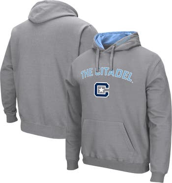 The Men's Colosseum Gray Citadel Bulldogs Arch & Logo Pullover Hoodie is the perfect way to show unwavering support for the Citadel Bulldogs. Crafted from a soft cotton and polyester blend, this midweight hoodie ensures comfort and warmth during chilly game days. Embroidered fabric applique and graphics proudly display the Citadel Bulldogs logo and arch, making it a stylish and spirited addition to your game day wardrobe. Whether cheering from the stands or simply showing support, this hoodie is the perfect way to represent the Citadel Bulldogs in style.
