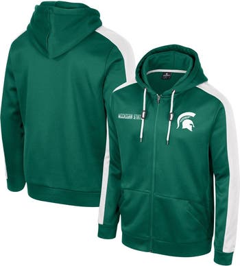 The Men's Colosseum Green Michigan State Spartans Reese Full-Zip Hoodie is the perfect way to show your support for the Spartans. Made from durable polyester, this midweight hoodie is ideal for moderate temperatures. Two front pockets provide ample storage, while screen-printed graphics proudly display your Michigan State Spartans pride. The drawstring with toggle sliders ensures a comfortable fit, making this hoodie a must-have for any Spartans fan.