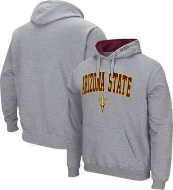 The Men's Colosseum Heather Gray Arizona State Sun Devils Arch & Logo 3.0 Pullover Hoodie is the perfect way to show unwavering support for the Arizona State Sun Devils. This midweight hoodie features a cozy fleece lining, ideal for chilly game days. Embroidered fabric applique and contrast-color hood lining add style, while the front pouch pocket provides convenient storage. Whether cheering from the stands or showing support, this hoodie represents the Arizona State Sun Devils.