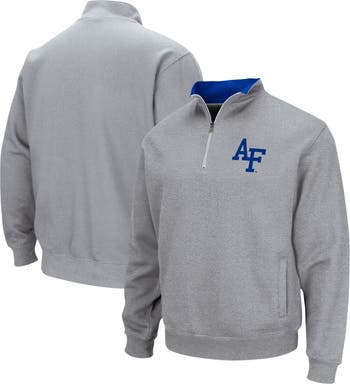 Represent your Air Force Falcons with pride in the Men's Colosseum Heathered Gray Air Force Falcons Tortugas Team Logo Quarter-Zip Jacket. This midweight jacket is perfect for moderate temperatures, featuring a cozy fleece lining and an Olympic collar for added warmth. The embroidered Tortugas team logo proudly displays your unwavering support for the Air Force Falcons, while the two front pockets provide convenient storage for your essentials.