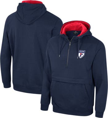 The Men's Colosseum Navy Pennsylvania Quakers Team Half-Zip Pullover Hoodie is the perfect way to show your support for the Pennsylvania Quakers. Made from a comfortable cotton and polyester blend, this midweight hoodie features a fleece lining for added warmth during chilly game days. Embroidered fabric applique proudly displays the Pennsylvania Quakers logo, while the front pouch pocket provides convenient storage for your essentials. Whether you're cheering from the stands or simply showing your support, this hoodie is the perfect way to represent the Pennsylvania Quakers in style.