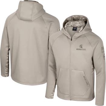 Support your favorite cause and team with this Michigan State Spartans Operation Hat Trick Battalion Raglan Fleece Hoodie from Colosseum. This midweight hoodie with a soft fleece lining is suited for moderate temperatures. The sublimated camo design in the hood lining and inner sleeves makes for a unique and spirited look.