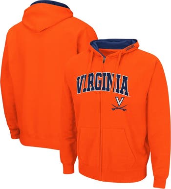 The Men's Colosseum Orange Virginia Cavaliers Arch & Logo 3.0 Full-Zip Hoodie is the perfect way to show your unwavering support for the Virginia Cavaliers. This midweight hoodie features embroidered fabric applique and graphics, a cozy fleece lining, and a full-zip closure for easy layering. The hood with drawstring provides extra warmth and protection from the elements, while the two front pockets offer convenient storage for your essentials. Whether you're cheering on the Cavaliers at the game or just relaxing at home, this hoodie is sure to keep you comfortable and stylish.