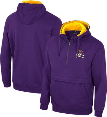 The Men's Colosseum Purple ECU Pirates Team Half-Zip Pullover Hoodie is the perfect way to show your support for the ECU Pirates. Made from a comfortable cotton and polyester blend, this midweight hoodie features a fleece lining for added warmth during chilly game days. Embroidered fabric applique proudly displays the ECU Pirates logo, while the front pouch pocket provides convenient storage for your essentials. Whether you're cheering from the stands or simply showing your support, this hoodie is the perfect way to represent the ECU Pirates in style.