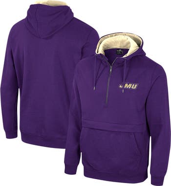 The Men's Colosseum Purple James Madison Dukes Team Half-Zip Pullover Hoodie is the perfect way to show your support for the James Madison Dukes. Made from a comfortable cotton and polyester blend, this midweight hoodie features a fleece lining for added warmth during chilly game days. Embroidered fabric applique proudly displays the James Madison Dukes logo, while the front pouch pocket provides convenient storage for your essentials. Whether you're cheering from the stands or simply showing your support, this hoodie is the perfect way to represent the James Madison Dukes in style.