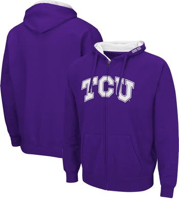 The Men's Colosseum Purple TCU Horned Frogs Arch & Logo 3.0 Full-Zip Hoodie is the ultimate way to show your unwavering support for the TCU Horned Frogs. This midweight hoodie features embroidered fabric applique and graphics, ensuring your team spirit shines through. Its fleece lining and hood with drawstring provide warmth and comfort, making it perfect for chilly game days. Whether you're cheering from the stands or simply representing your favorite team, this hoodie is a must-have for any TCU Horned Frogs fan.