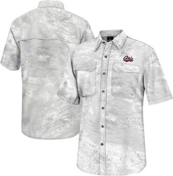 The Men's Colosseum White Montana Grizzlies Realtree Aspect Charter Full-Button Fishing Shirt is the perfect way to show your support for the Montana Grizzlies. Made from durable polyester, this shirt features rubberized graphics and a mesh lining for breathability. Two chest pockets with hook and loop closures provide ample storage, while the rounded hem and ventilated back panel keep you comfortable all day. Whether you're fishing, hiking, or cheering on the Grizzlies, this shirt is a must-have for any fan.
